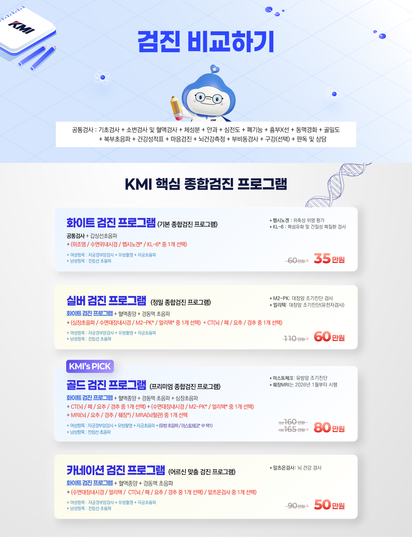 KMI 핵심 종합검진 프로그램 중 하나인 실버 검진입니다. 기본 건강검진(화이트) 프로그램에 최근 발병률이